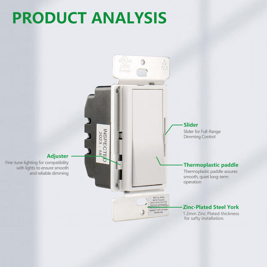 Dimmer Switch,Single Pole/3-Way,150W Dimmable LED/CFL Lights,Halogen and Incandescent Bulbs 600W Max,AC120V,Cover Plate Included,UL Listed,White